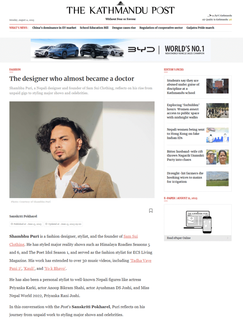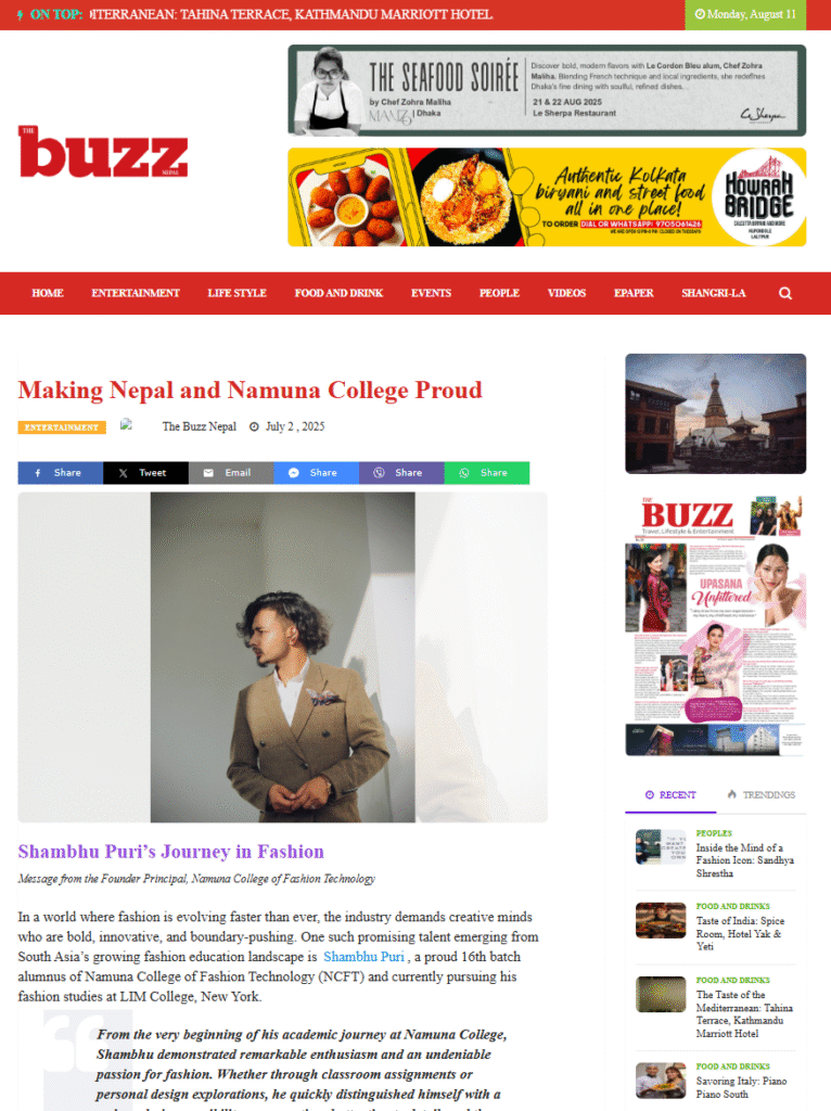 With an impressive portfolio spanning films, TV shows, magazines, editorials, and music videos, Shamvu has made a significant mark in the Nepalese fashion industry and beyond. His work has been recognized with prestigious awards, including the Best Costume Designer Award at the 8848 Himalayan Music & Film Awards USA 2025. His talent and influence have also been featured in leading fashion magazines and national TV interviews, establishing him as a rising force in contemporary fashion.